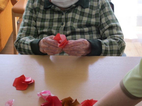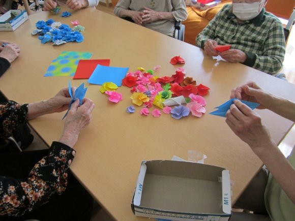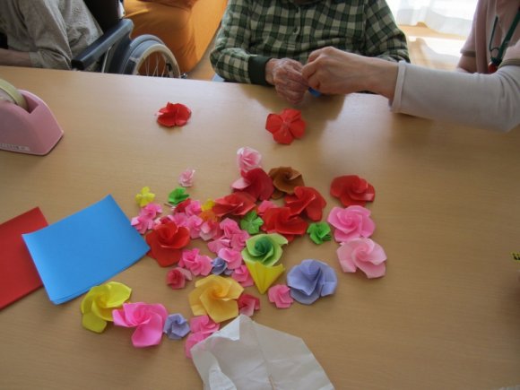 2019年05月26日(日) 五月のイベント 五月五日 今日は子供の日! 本日のおやつ~! かわいい!! おいしそうだプ~!いただきま~ぷ! 菖蒲湯イベント~! 菖蒲の葉があたってくすぐったいぷー! 今年は風邪 ひかないかなーぷ! この日はフロアーのレクリエーションで薔薇の花を作ってまあーす! 私達って 手先が器用なんでーす! 出来上がりが楽しみでーす! みごとに薔薇の花が出来ました! 今日は外出レクで外食に行きました! ご馳走ですね!! 気分転換になって とってもおいしいです! また皆さんで美味しい物食べに行きましょうね~!