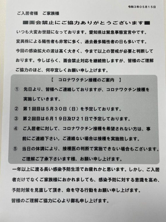 今しばらく、面会禁止対応を継続して参りますが、