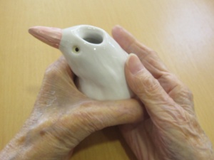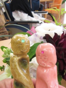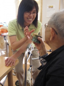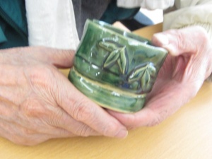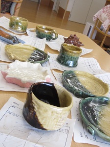 2015年11月14日(土) 陶芸教室の作品が出来上がりました! 10月に開催された陶芸教室の作品を海田先生が届けてくださいました 個性豊かな作品が勢ぞろい! 白寿になられたT様の白鳥の一輪挿しです。かわいいでしょう! 今年のにぎり地蔵様です。いいお顔ですね。 出来上がった湯呑でスタッフとカンパーイ!M様も笑顔いっぱいでした! T様作青竹のぐい飲みです「100点の出来栄え!大満足!これで焼酎をのみたいな!」 今月28日はかざぐるま感謝祭を開催します。皆様のご参加を心待ちにしています。