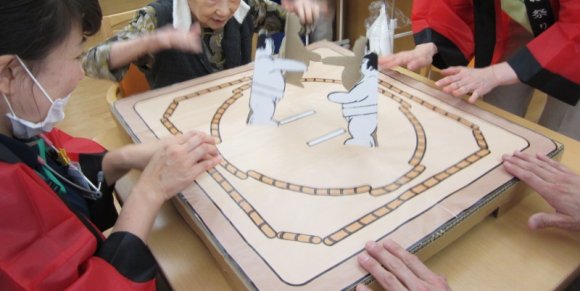 手作りの土俵で紙相撲を楽しみました