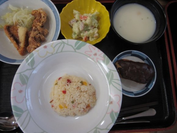 お昼ご飯のメニューは、ピラフ、揚げ物盛り合わせ、アボガドサラダ、エクレア、クリームポタージュでした。 おやつは、かしわもちでした