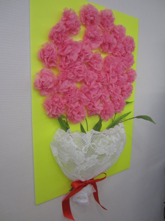 みなさまの思いを一つにし、リレーゲームでこんなに大きなカーネーションの花束を完成させました