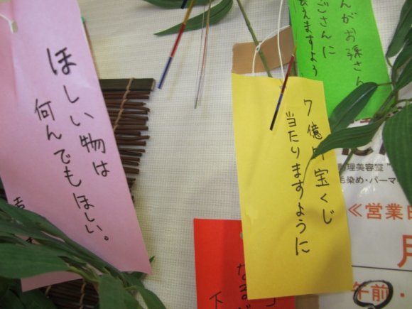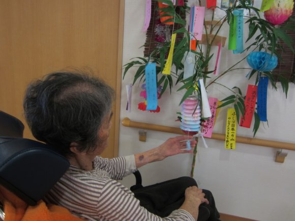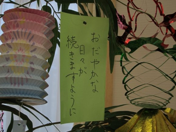 七月七日は七夕でしたね。かざぐるまでも笹飾りを作りました。短冊に書いたお願い事は何でしょうか?ちょっと覗いてみましょう!